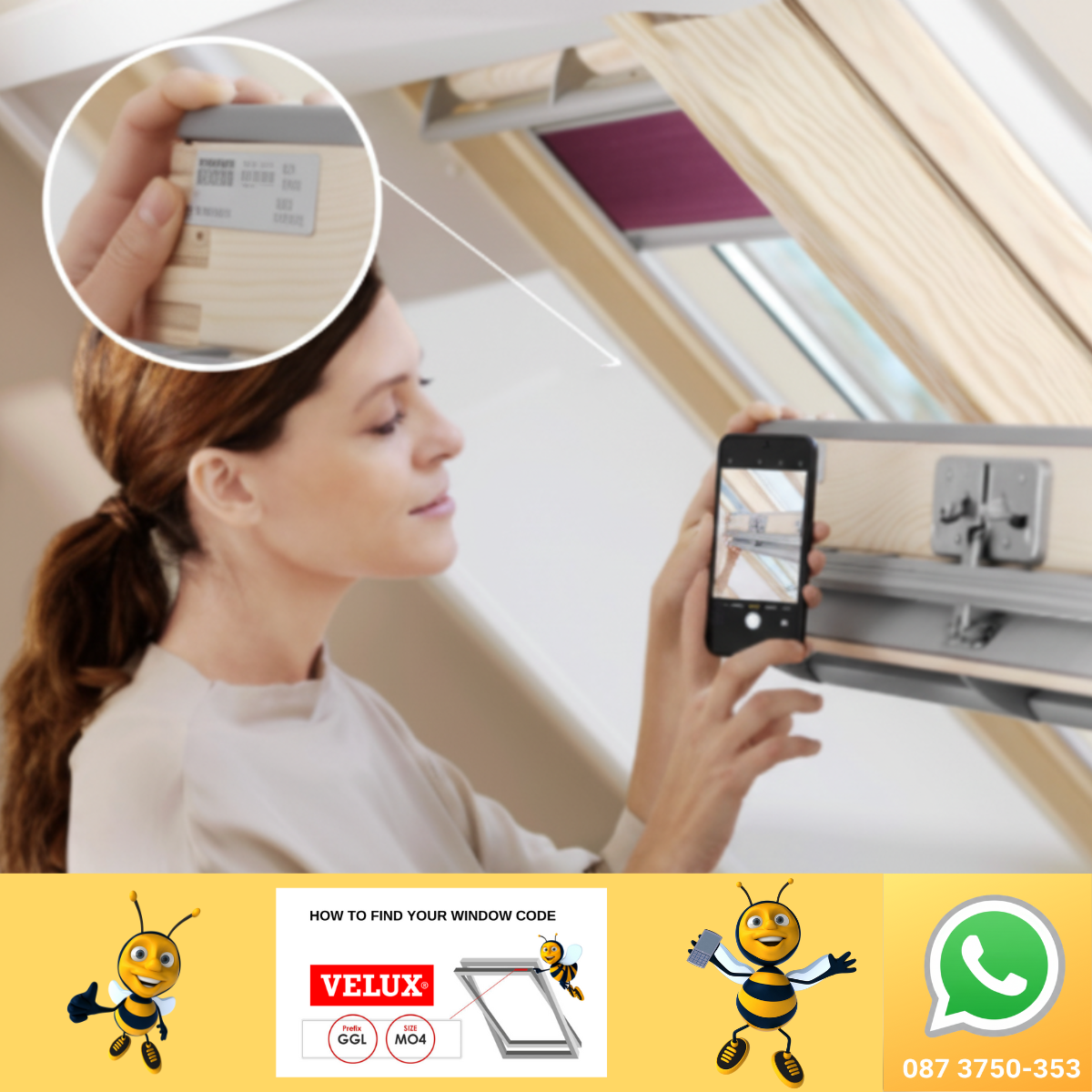 Don’t worry! Every roof window has a little code plate on the frame. If you’re having trouble, just snap a quick photo of it and WhatsApp us on 087-375-0353, or email it to info@bizzyblinds.ie.